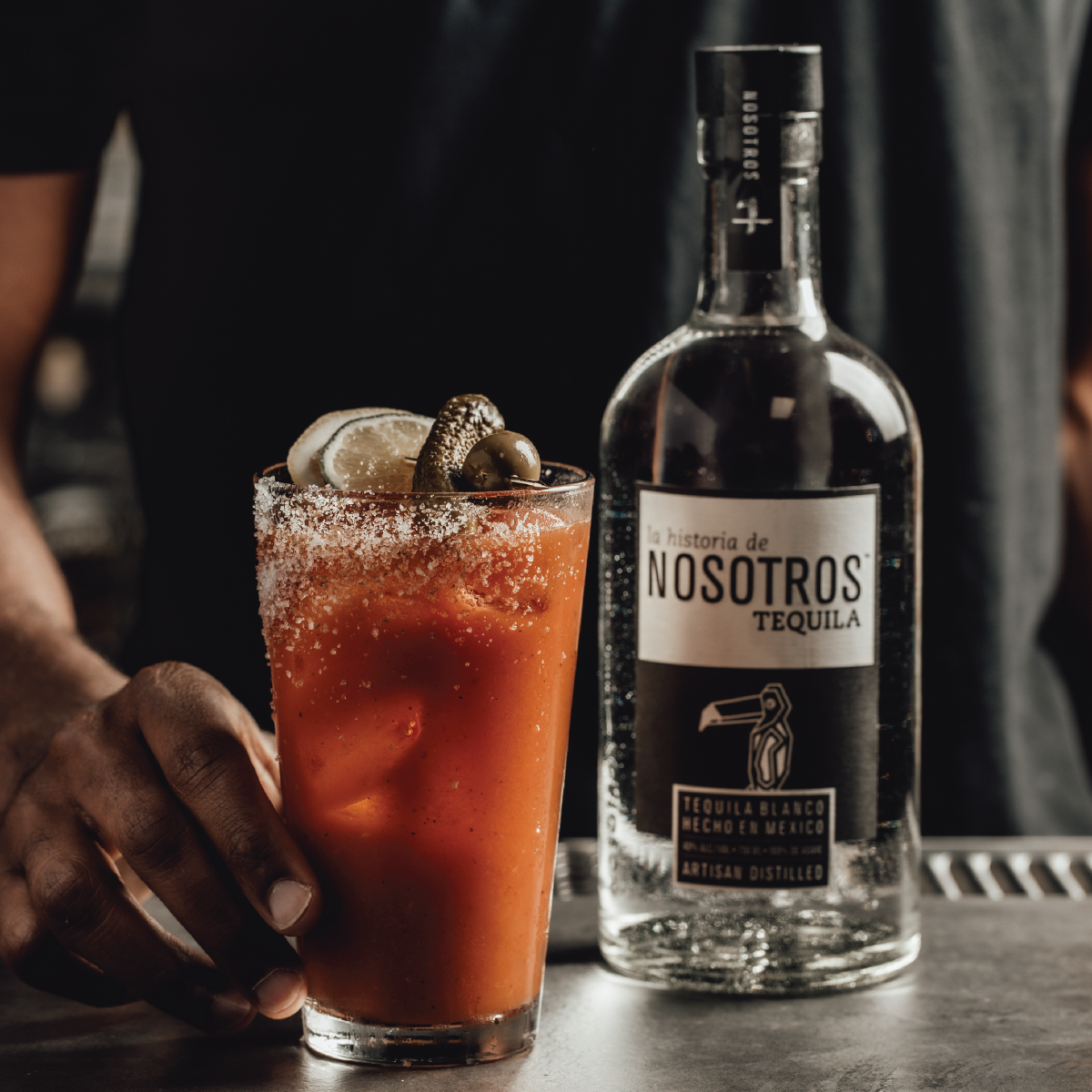 - Add the Nosotros Blanco, the tomato juice, the lime juice, the horseradish, the Worcestershire sauce, and the hot sauces.