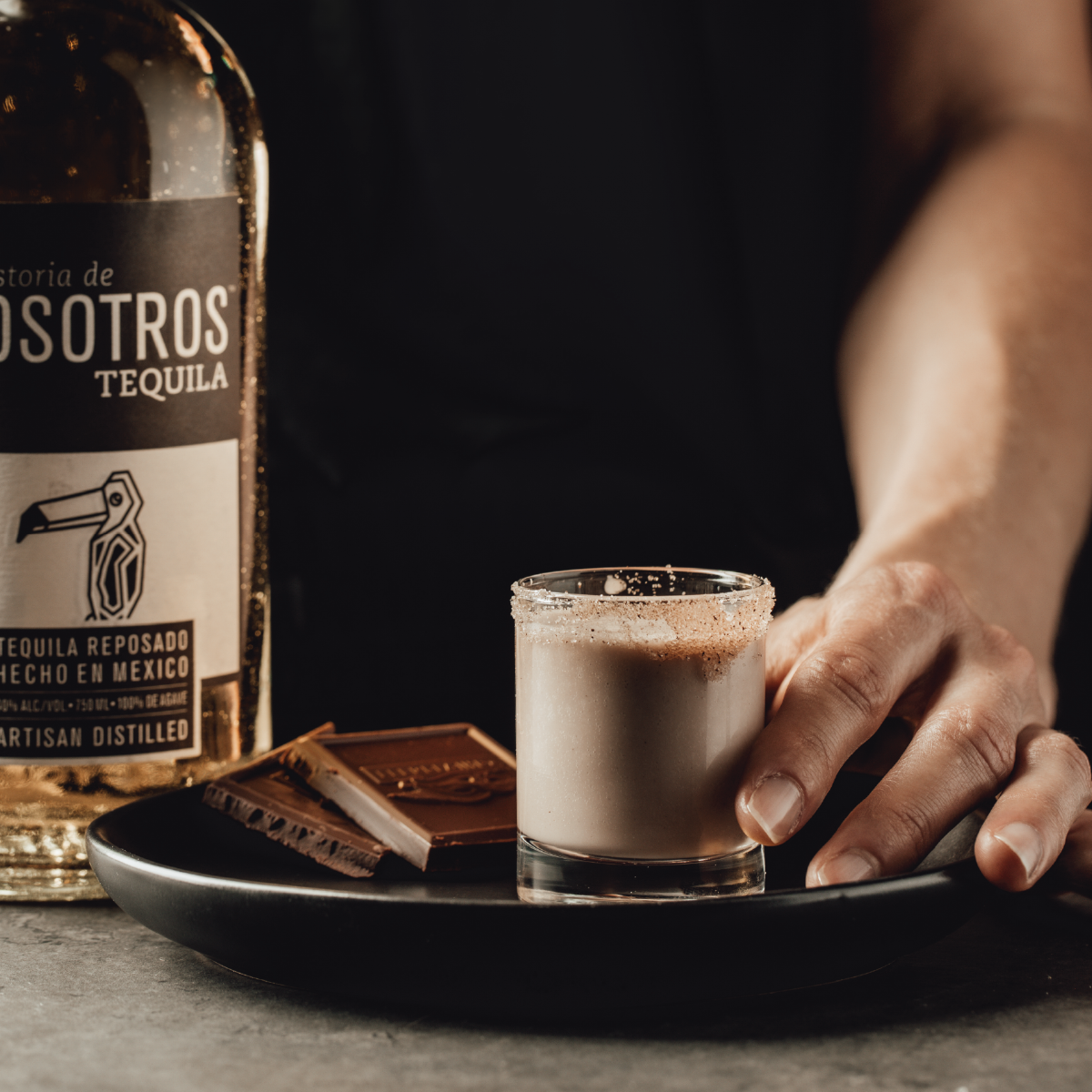 - In a shaker, add the Nosotros Reposado, the coconut milk, the agave nectar, the cocoa powder, the KahlĂșa, and ice.