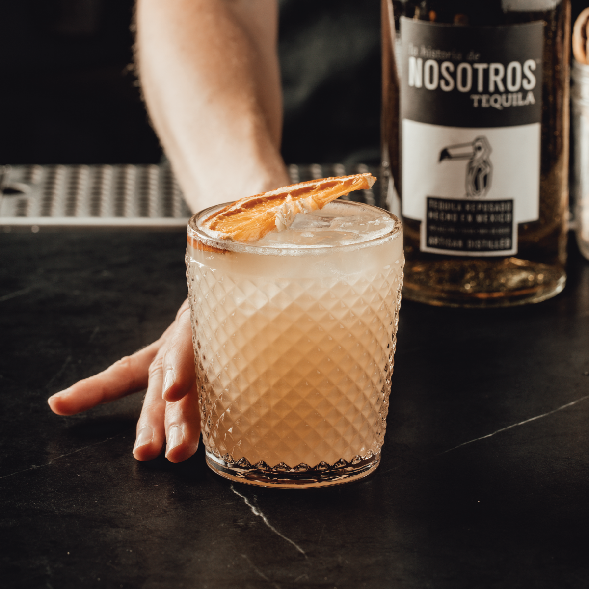 - In a shaker, add the Nosotros Reposado, the amaretto liqueur, the orange juice, the lime juice, and ice.
