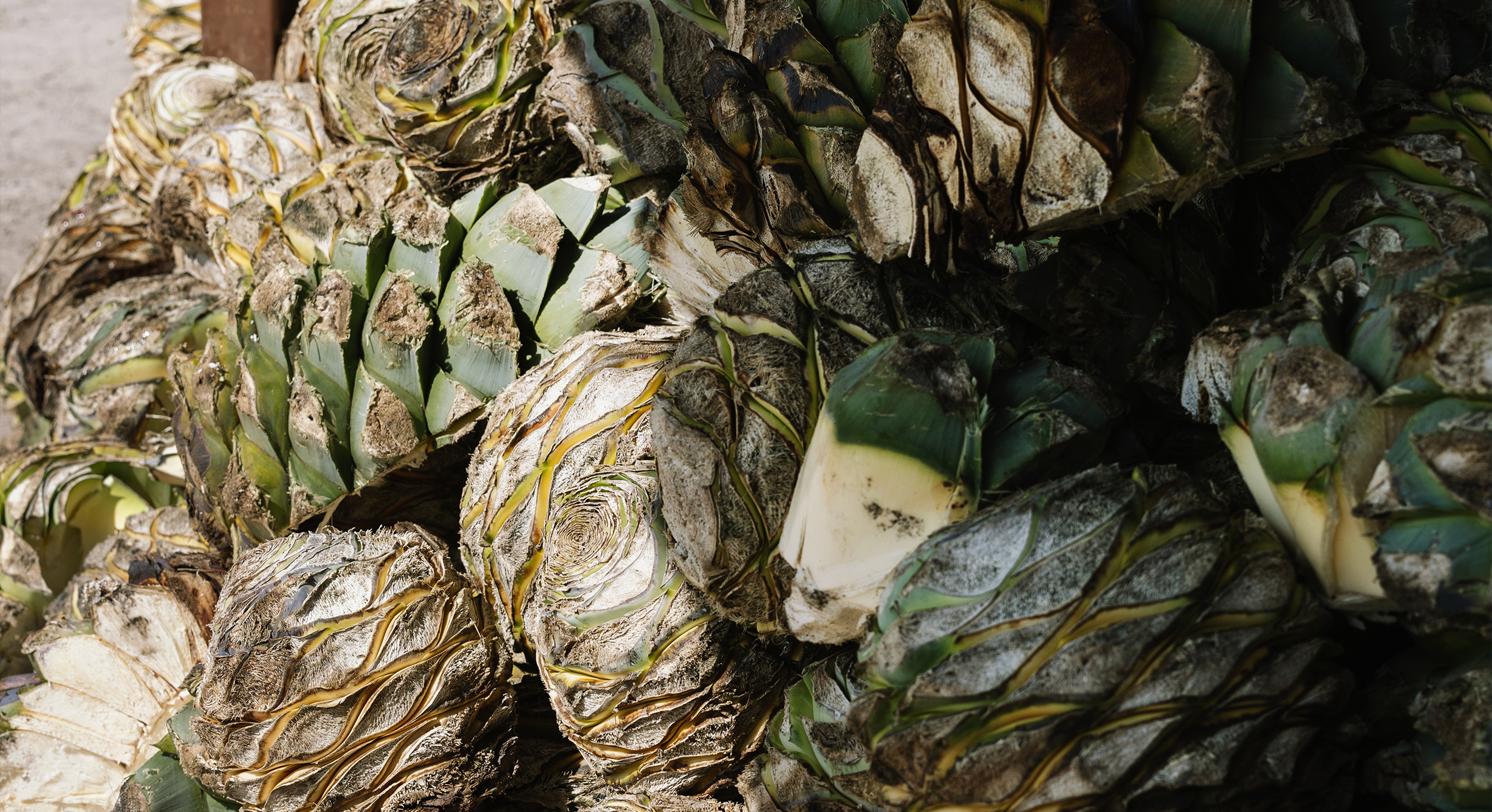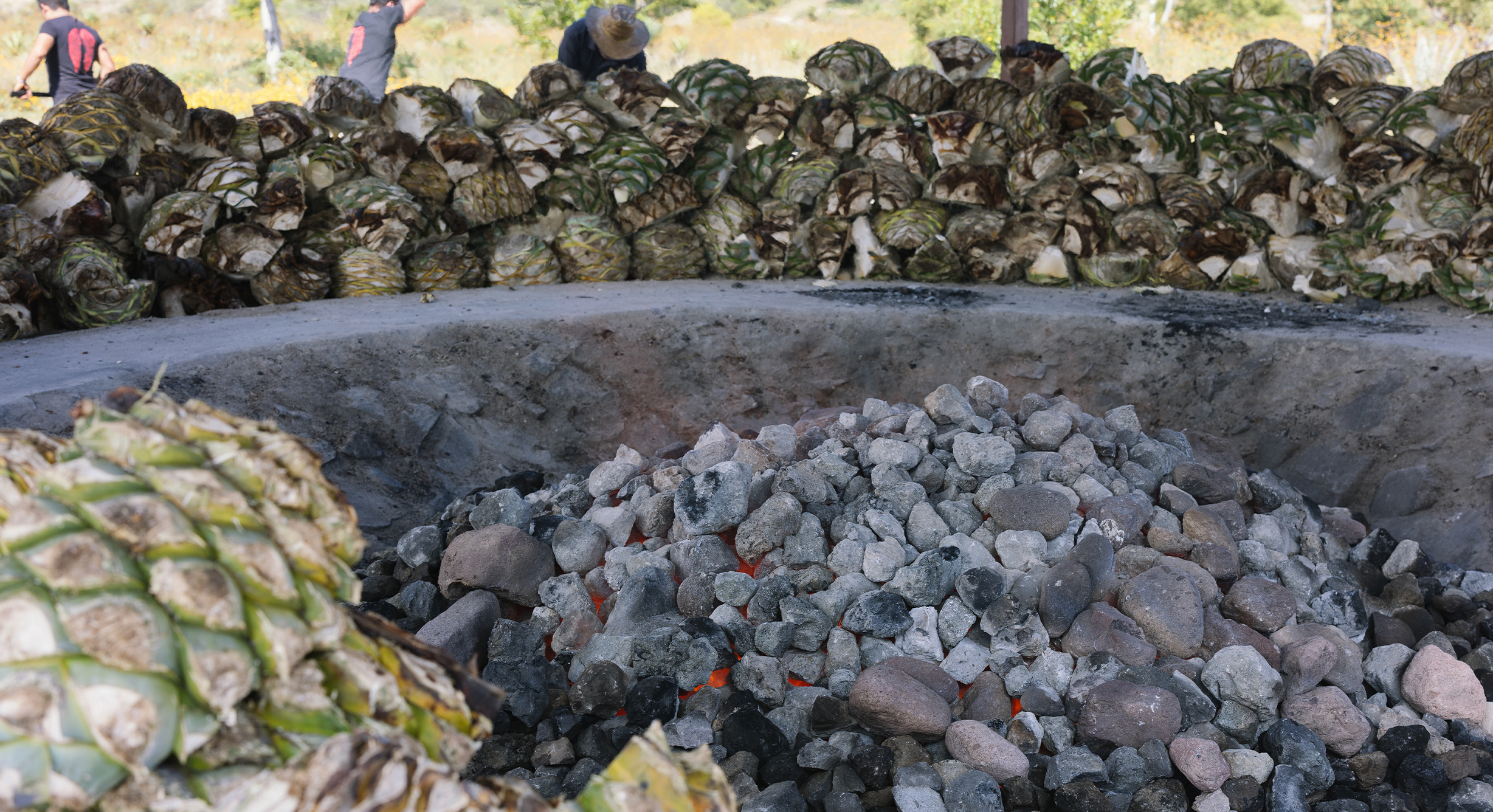 The magueys are cooked in a concave rock oven dug on the floor.