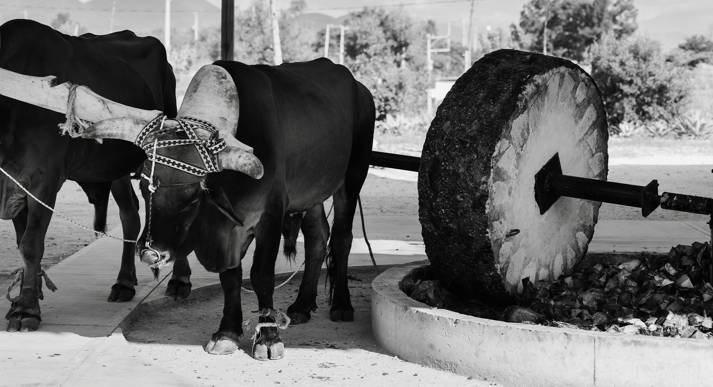 Cookled agave is milled with a traditional Tahona (rock mill).
